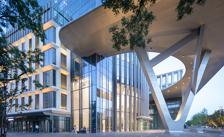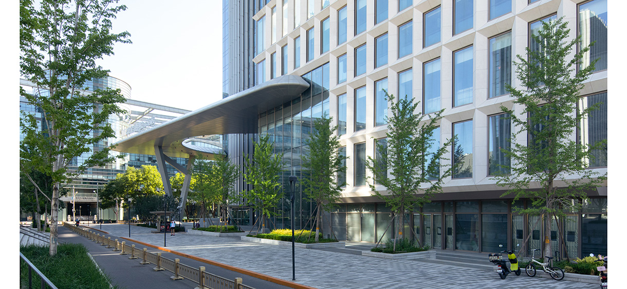 At 21 stories, Beijing Financial Technology Center is a landmark in Beijing’s Xicheng district—a newly designated high-tech enterprise zone. A bold, sculptural roof connects with the contours of the original structure; it also capitalizes on branding opportunities inherent in its height and proximity to Beijing’s second ring road. The canopy at the street level clearly defines a grand new central entryway, making it easy for people to find their way into the building.