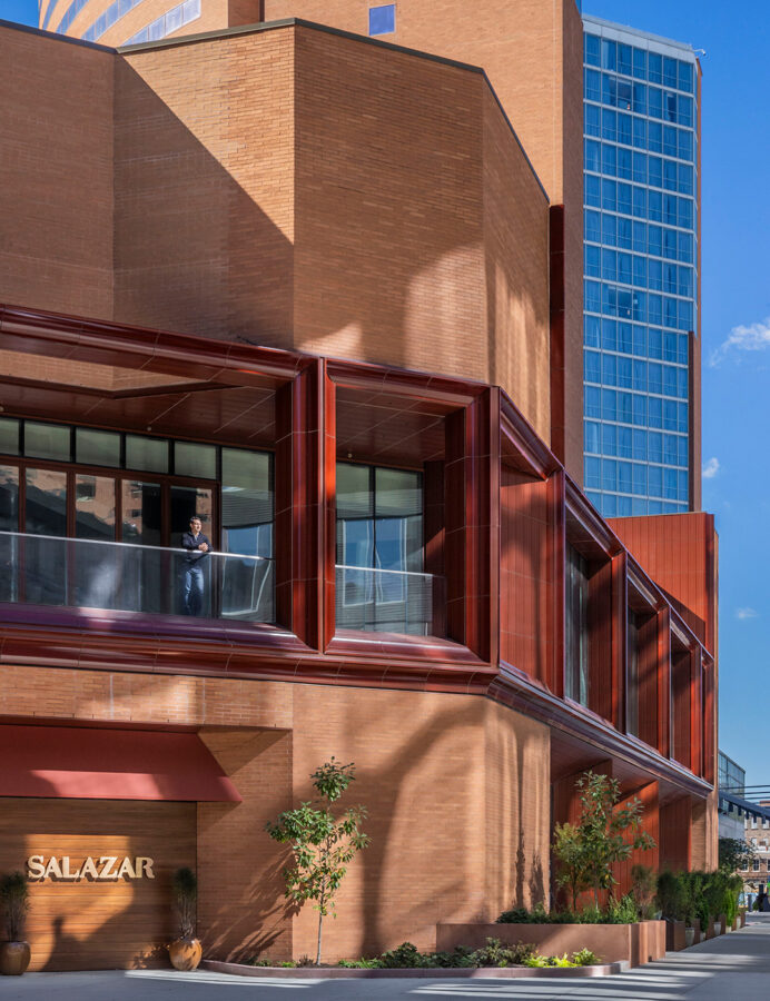 “We wanted a material that would have a natural dialogue with the original brick façade,” says Adam Fosnaugh, part of the GBBN design team for the project. “With a clay-fired product like brick, the warm, semi-transparent glaze selected for the terracotta panels allows the clay material to show through. Terracotta was also chosen to highlight the geometry of the new openings in a way that acknowledges the original while accentuating the new.”