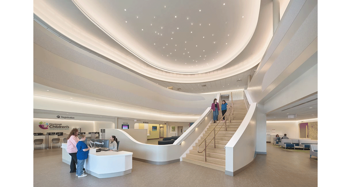 Understanding how children learn through play informed the building’s design. Several integrated interior elements were combined to create an experience that feels supportive, uplifting, and caring—all hallmarks of Cincinnati Children’s. Soft, rounded edges; the interplay of light and shadow; and opportunities for physical movement—whether around the building’s central stair or along outdoor walking paths that connect to additional paths in the development—invite discovery.