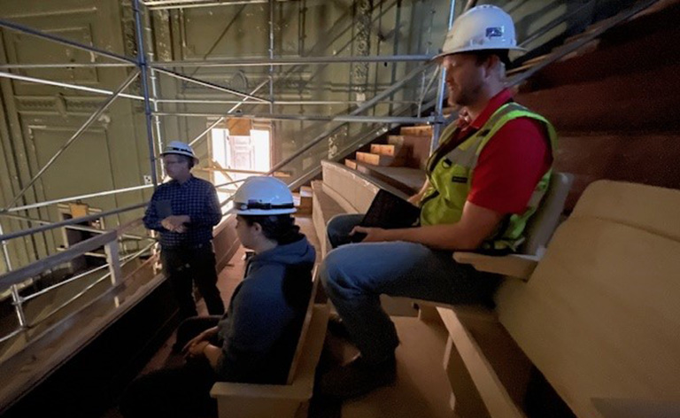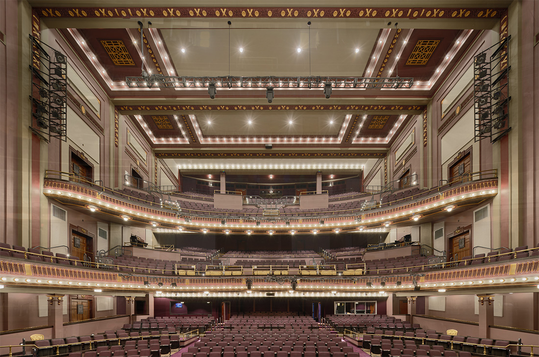 Designed for symphonic music, the Emery’s stage lacks the wide wings and depth that dramatic theaters typically require. This is part of the reason it had fallen into disuse in recent years. To overcome this challenge, the renovation makes use of technology—notably, an oversized LED screen at the back of the stage and a 16-foot turntable and stage lift that can complete scene changes from beneath the stage in seconds. Installation of projection mapping allows production teams to wash the walls in front of the stage in light to create a scene that embraces its audience.