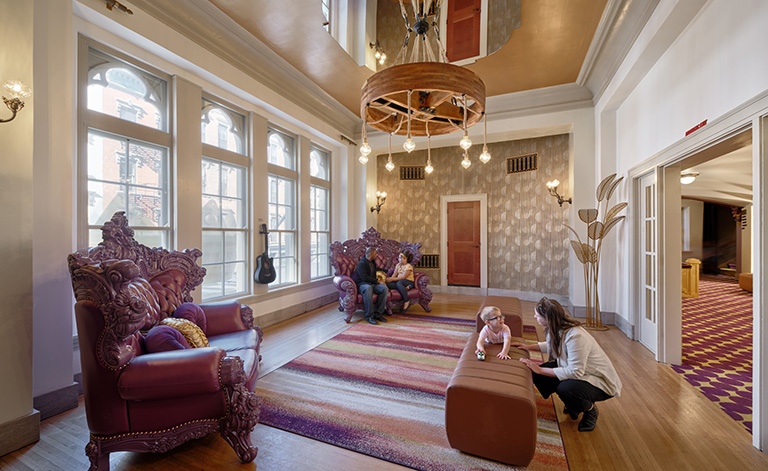 The Emery was not only TCT’s home from 1949-1969, but its beautifully ornamented historic fabric has been woven together with distinctly modern technology to produce an immersive, ever-changing experience that cultivates childlike wonder long before the curtain rises. An expanded lobby highlights features of the historic box office and marble-lined foyer, mingling the building’s antique interiors with neon signs, color-changing walls, and theatrical props.