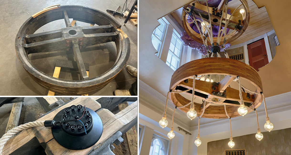 Working with our in-house Computational Design & Fabrication experts, our design team saw an opportunity to connect the old and the new by recycling a disused piece of theater history (an old stage pulley) into a chandelier.