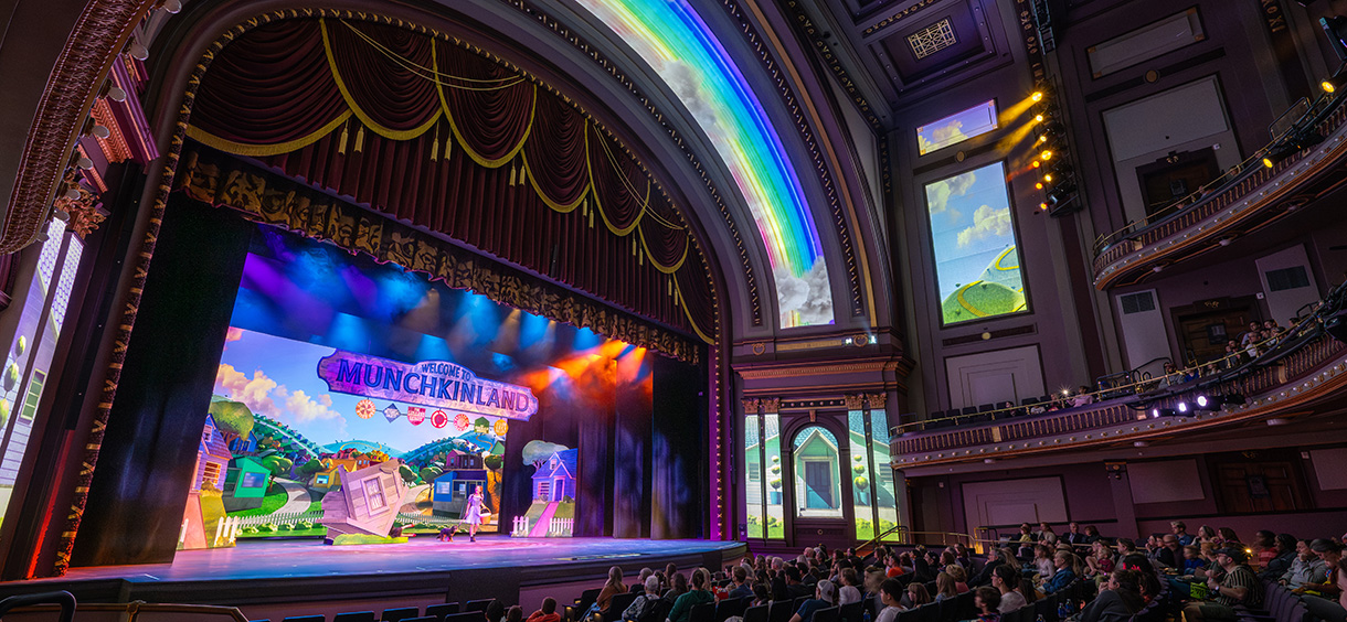 A historic theater enhanced by modern technology: Projection mapping washes the proscenium arch and walls, reaching beyond the stage to immerse its audience in the dramatized world.