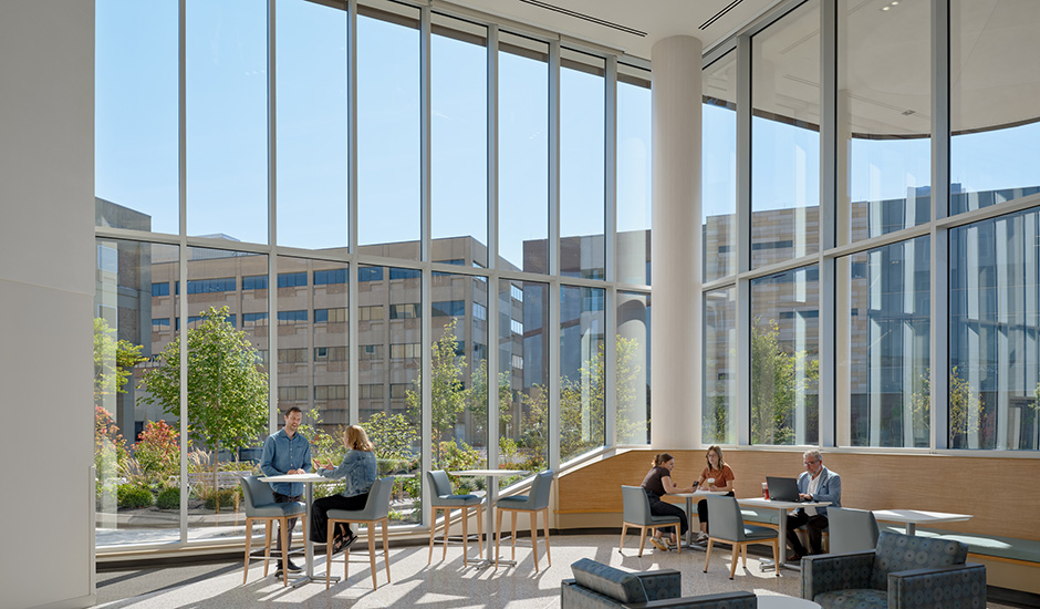 The waiting areas in the new cath lab provide visitors with different seating choices that allow them to work, read, or socialize in ways that feel comfortable to them.