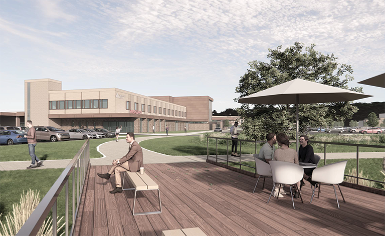 Community health and well-being is part of Margaret Mary’s mission. The new campus will include public walking trails throughout that connect to trails on the existing hospital site as well as nearby Freedom Park. These peaceful paths will contribute to a healing environment where both healthcare workers and community members can relax and recharge. The hospital’s community hub will be conveniently situated on the first floor near the café, which will include outdoor seating with garden views, to help blur the line between interior and exterior spaces. The community hub and café were designed to foster socializing by providing patients, visitors, and staff an inviting and comfortable space to have a meal, connect with colleagues, or work while waiting for a loved one undergoing treatment.